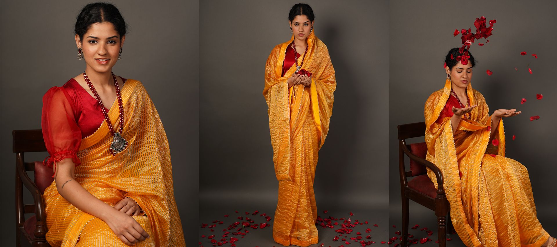 As the name suggests, The sarees in the Kaleidoscope collection are inspired by the intricate patterns and ever-changing colours of the kaleidoscope. This collection features a variety of fabrics, including silk, cotton, chiffon, georgette, and more. Each carefully selected to enhance the drape and elegance of the ensemble.